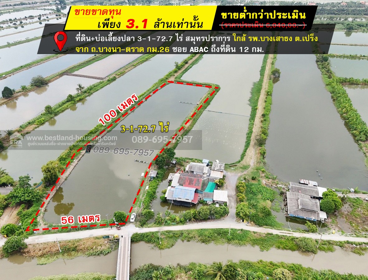 ขายที่ดิน+บ่อเลี้ยงปลา ย่านบางบ่อ 3-1-72.7 ไร่ ใกล้ รพ. บางเสาธง ถ.บางนา-ตราด กม.26 (ซอย ABAC) ต.บางเสาธง บางพลีใหญ่ ราคาถูกกว่าประเมินกรมที่ดิน ขายขาดทุน !!รับคุยทุกเงื่อนไข