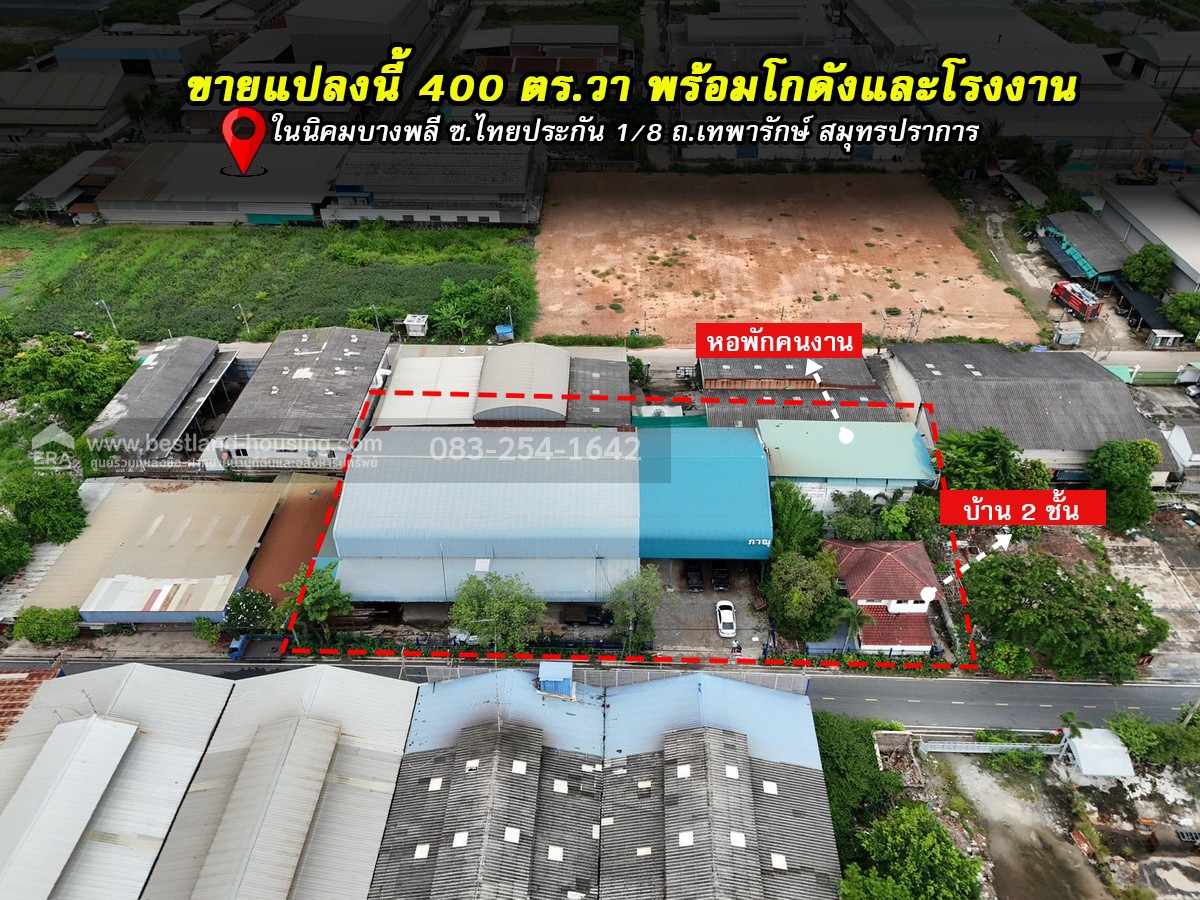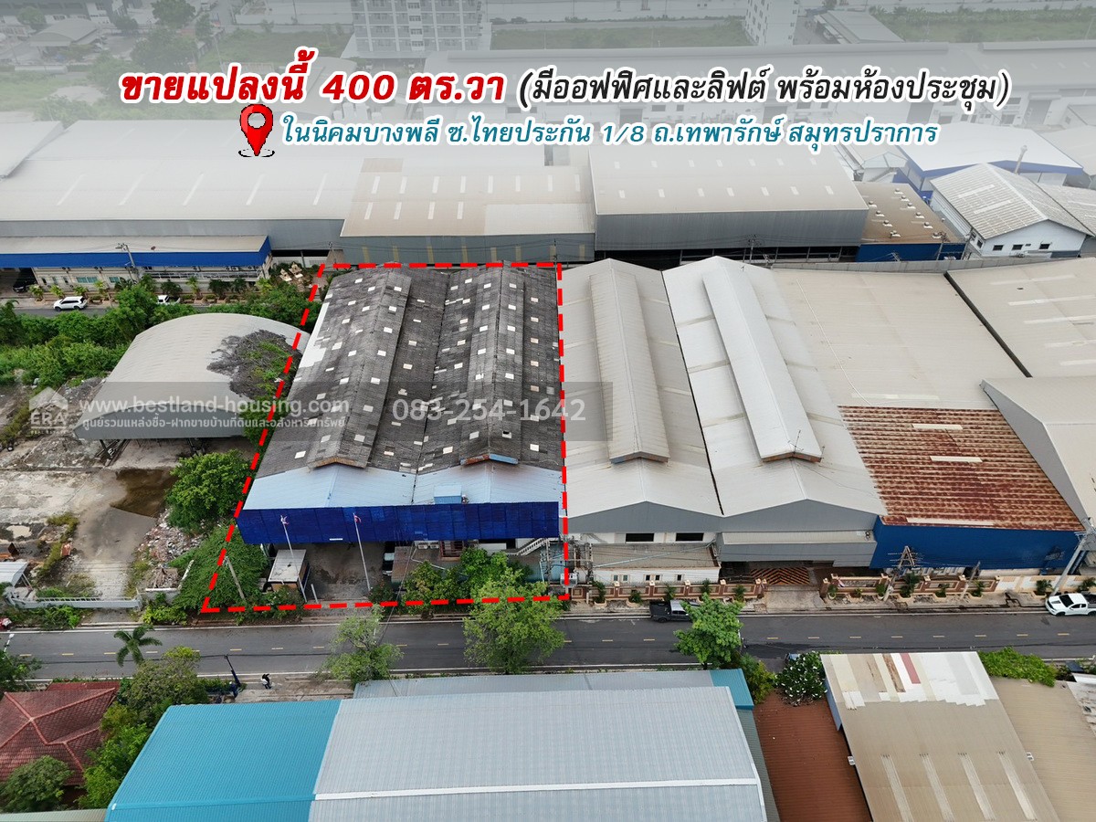 ขายที่ดินพร้อมโกดังและโรงงาน ในนิคมบางพลี สมุทรปราการ ซ.ไทยประกัน 1/8 ถ.เทพารักษ์ ขนาด 400 ตร.วา ทำเลดี การคมนาคมสะดวก ใกล้ถนนหลัก