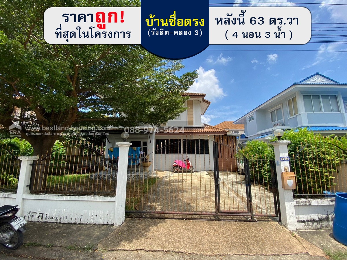 ขายบ้านซื่อตรง รังสิต-คลอง 3 ปทุมธานี บ้านเดี่ยว 63 ตร.วา ราคาถูกที่สุดในโครงการ ใกล้ฟิวเจอร์พาร์ครังสิต และเซียร์รังสิต