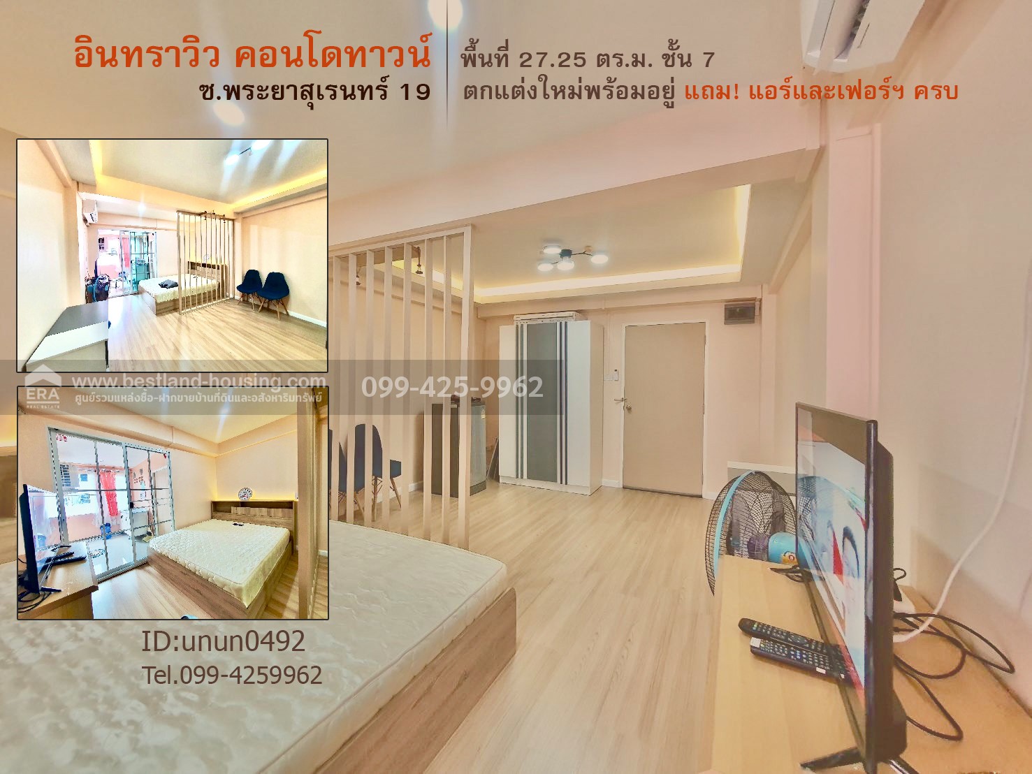 ขายคอนโด อินทราวิว คอนโดทาวน์ ซ.พระยาสุเรนทร์ 19 พื้นที่ 27.25 ตร.ม. ชั้น 7 ห้องตกแต่งใหม่พร้อมอยู่ แถมแอร์และเฟอร์นิเจอร์ครบ
