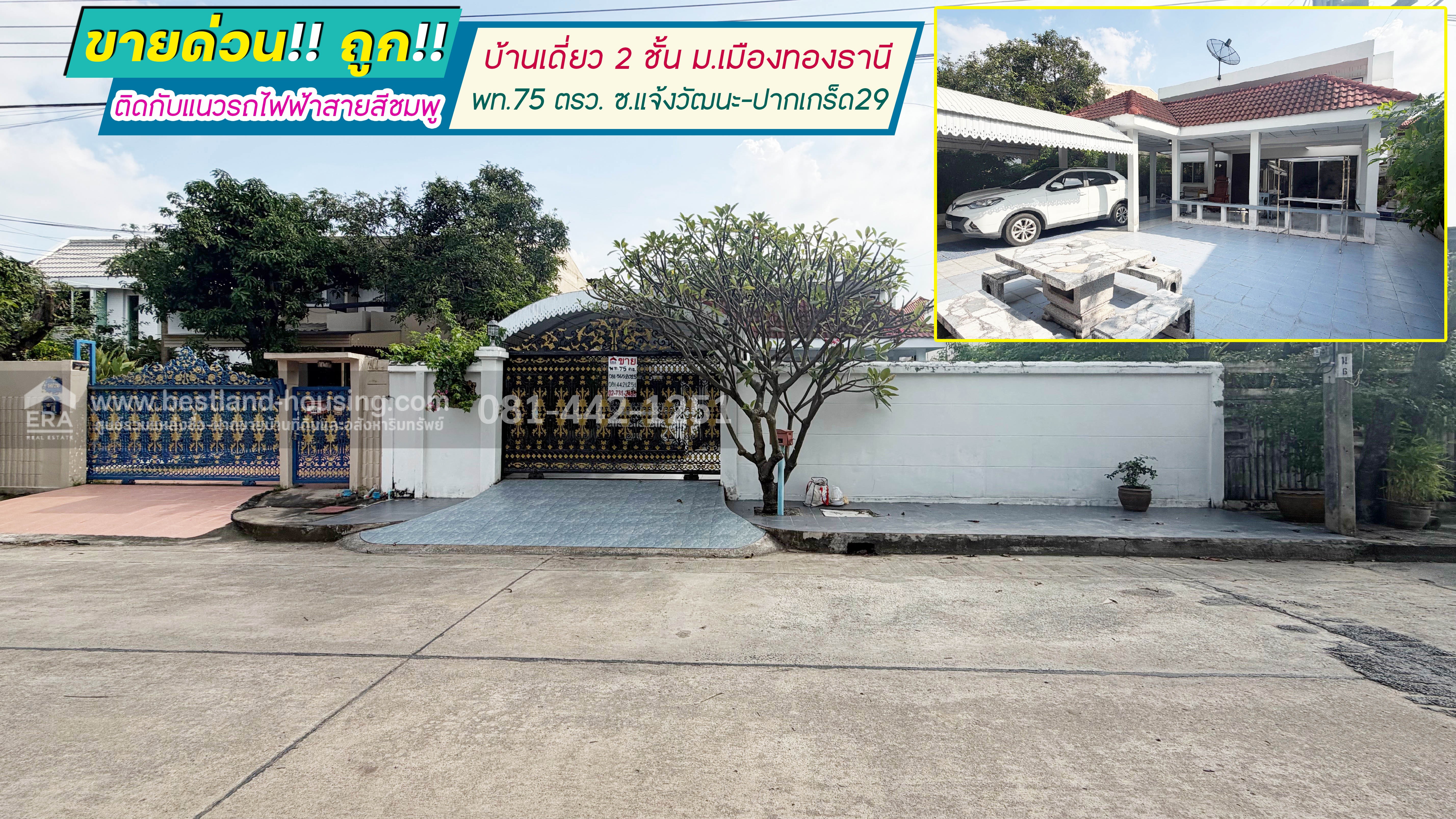 ขายบ้านเดี่ยว 2 ชั้น หมู่บ้านเมืองทองธานี ซอยแจ้งวัฒนะ-ปากเกร็ด29 ย่านเมืองทองธานี พื้นที่ 75 ตรว. ขาย 13.5 ล้านบาท บ้านสภาพดี ติดกับแนวรถไฟฟ้าสายสีชมพู ใกล้สถานีศรีรัช