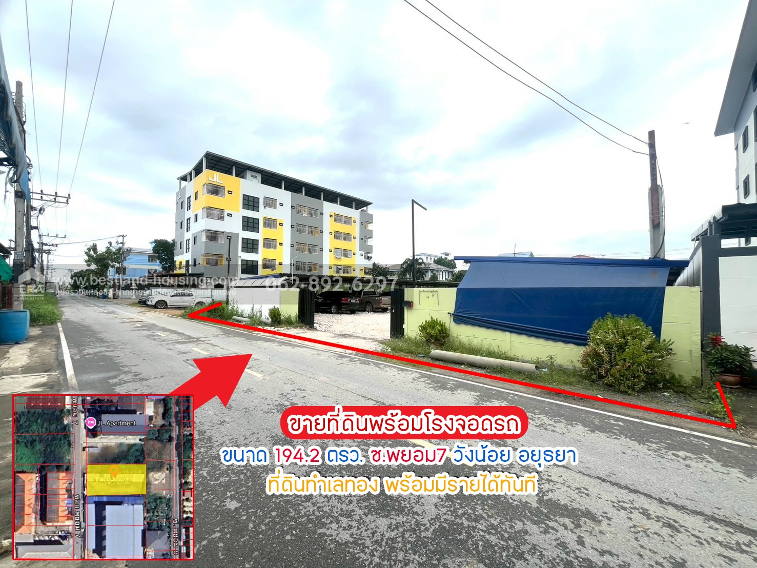 ขายที่ดินพร้อมโรงจอดรถ ซ.พยอม7 อ.วังน้อย อยุธยา ขนาด 194.2 ตารางวา ขายเพียง 4.3 ล้านบาท ขายที่ดินทำเลทอง พร้อมมีรายได้ทันที