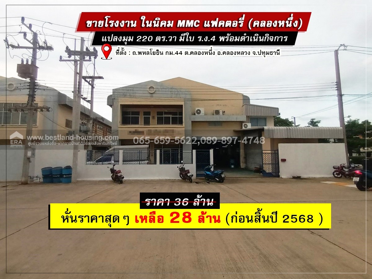 ขายโรงงาน นิคม MMC แฟคตอรี่ คลองหนึ่ง แปลงมุม 220 ตร.วา ถ.พหลโยธิน กม.44 คลองหลวง ปทุมธานี มีใบ ร.ง.4 พร้อมดำเนินกิจการ