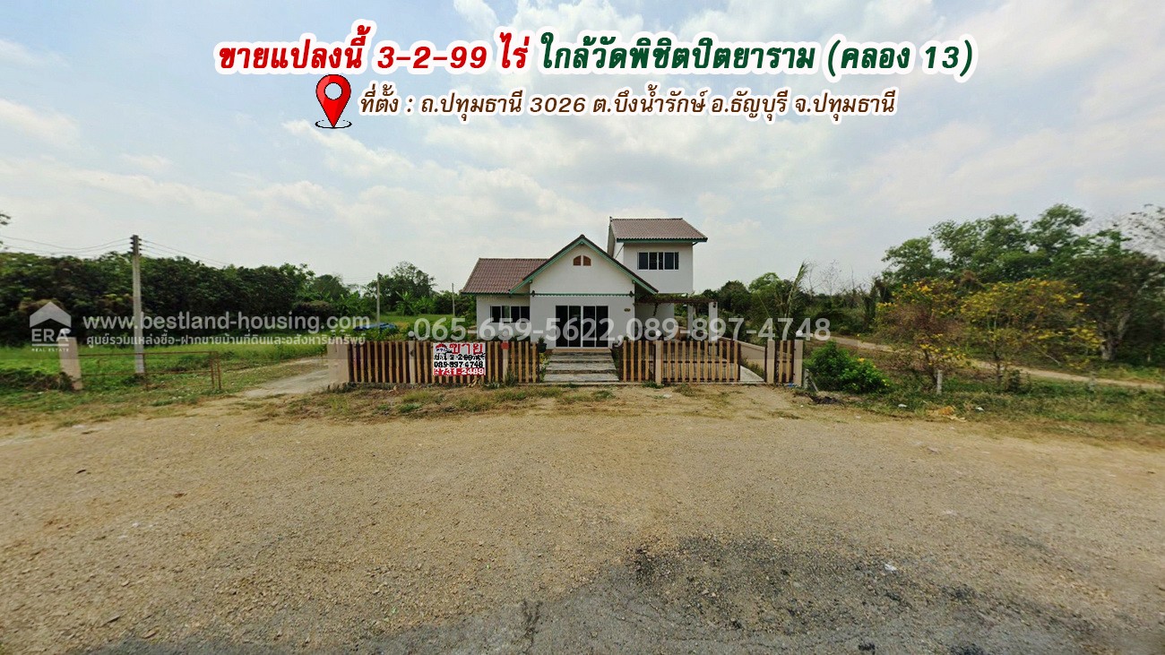 ขายที่ดินแถมบ้าน ติดถนนใหญ่เลียบคลอง 13 ธัญบุรี ปทุมธานี เนื้อที่ 3 ไร่ 2 งาน 99 ตร.วา ใกล้วัดพิชิตปิตยาราม,ถนนรังสิต-นครนายก ราคาขายถูกมาก/แบ่งขายได้