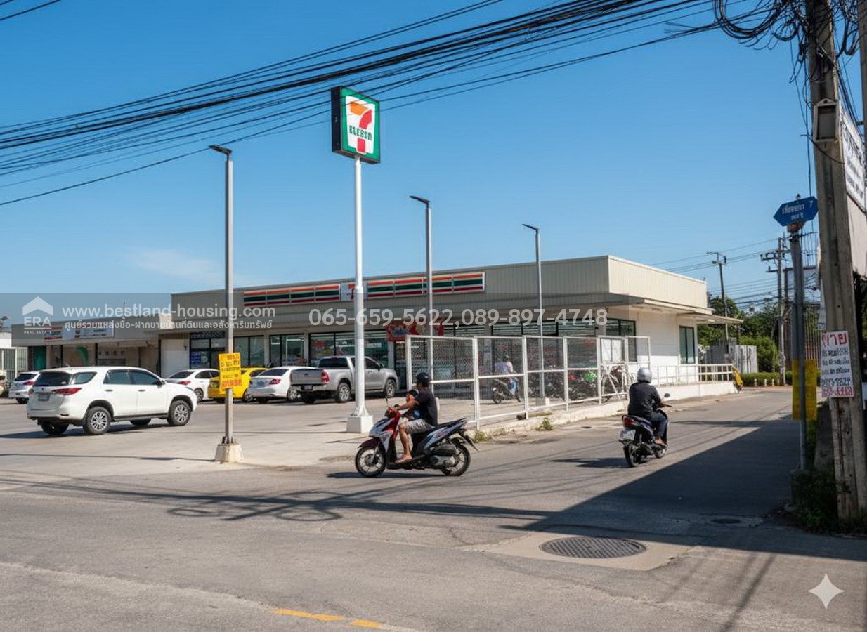 - ปากซอยทางเข้าหมู่บ้านมีร้านเซเว่น